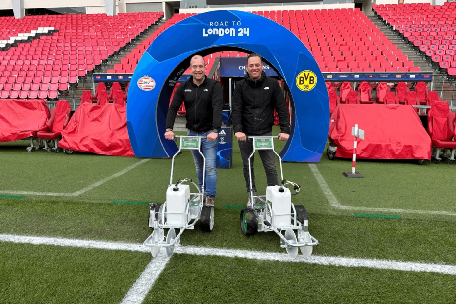 De Belijners en de Enk werken bij verschillende voetbalclubs samen, zo ook bij PSV. 'Om De Enk te ontlasten in de voorbereiding op deze belangrijke wedstrijd hebben wij dit keer de belijning van het stadionveld gedaan', vertelt accountmanager Jort Rood van De Belijners.