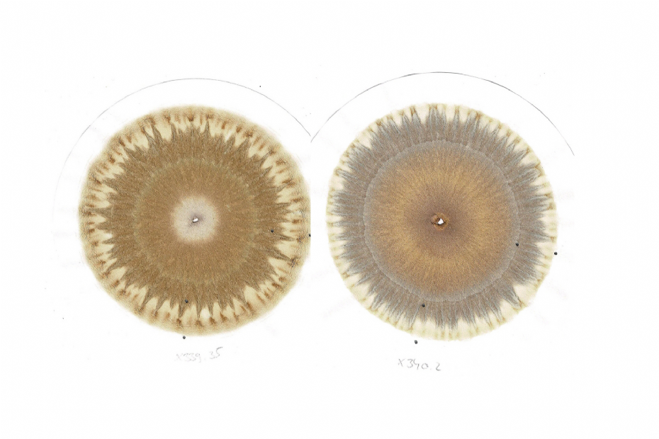 Bij chroma's maak je met lichtgevoelig zilvernitraat een afdruk van de conditie van een bodem en kun je de beschikbaarheid van mineralen achterhalen. Op de afbeelding links: goede bodemgesteldheid; rechts: met weinig zuurstof. Een chroma met een donker centrum betekent een slechte zuurstofvoorziening.
