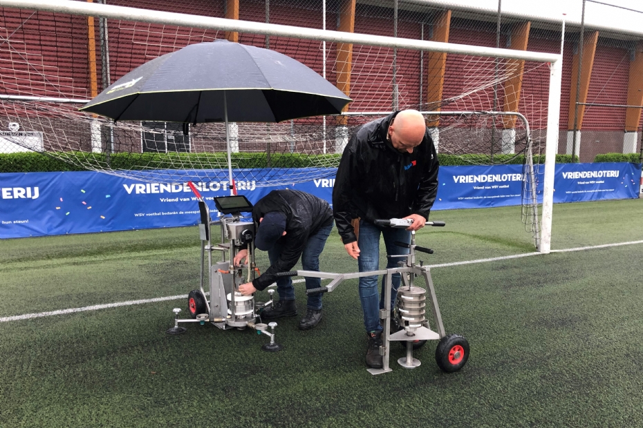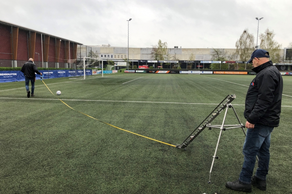 Om te ontdekken of het te keuren kunstgrasveld nog voldoet aan alle sporttechnische eisen, controleren ze vier verschillende aspecten: de stroefheid, de schokabsorptie, de balrol en de balstuit. Hiervoor laadt Kammer vier apparaten uit zijn bus: de torsiemeter, de triple A-meter, een metalen glijbaan voor het balrolvermogen en een lat met apparatuur om de balstuit te meten. Zij meten op zeven verschillende locaties op het veld en op elke locatie drie keer elk onderdeel. Dit levert een betrouwbaar beeld van de staat van het veld op. 'Daarnaast doen wij natuurlijk ook nog een visuele controle van het veld. Je ziet al snel of het onderhoud goed gedaan is, de belijning in orde is, de infill goed verdeeld is, de doelen netjes recht staan en of de dug-outs nog intact zijn. 'Voor een zuiver en objectief beeld zijn de metingen echter onontbeerlijk. Uit de cijfers blijkt precies of nog voldaan wordt aan de gestelde eisen. '88, 92 en 89,' somt Van Vulpen de resultaten van een balstuitmeting op. Zijn collega noteert ze op zijn tablet, net als de andere metingen die ochtend. Alle resultaten worden op kantoor door een andere collega verwerkt in een rapport dat bij wijze van spreken al diezelfde middag naar de club gestuurd zou kunnen worden.