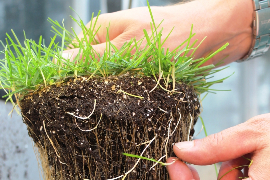Als het gaat om de juiste grassoorten, adviseert Van Putten een grasmengsel met een hoger veldbeemdpercentage. 'Veldbeemd is een zodevormer, die het geraamte van de grasmat vormt. Het is weerbaarder tegen invloeden van buitenaf, zoals hitte en droogte. Engels raaigras is een polvormer, die snel herstelt, maar ook sneller kiemt. Met een combinatie van deze twee soorten creëer je een mooi gesloten, vlakke en vitale grasmat.' Belangrijk is ook dat je bij in- en doorzaai steeds de allernieuwste grasrassen uit de Grasgids tot je beschikking hebt teneinde maximaal te profiteren van de genetische vooruitgang. Je herkent dat aan het Oranjeband-keurmerk op de zak, standaard bij alle graszaadmengsels van Advanta. Voor extra ondersteuning biedt Advanta de Advance-zaadcoating, die de groei en ontwikkeling van het plantje in de kiemfase ondersteunt. Hierdoor heb je tot wel twee weken voorsprong in kieming en vestiging.'
