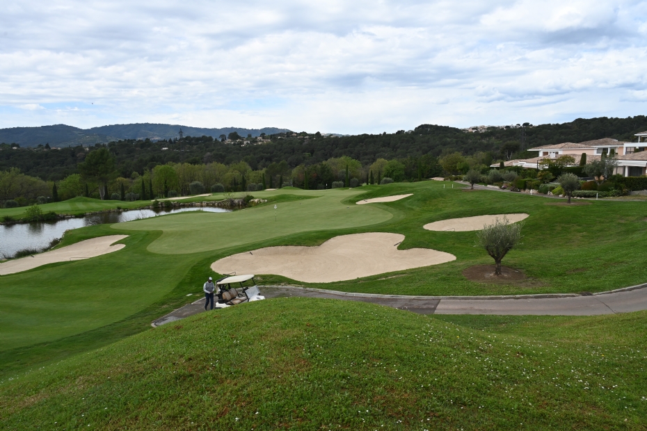 Als de Nederlandse delegatie Royal Mougins bezoekt, is de baan oogverblindend groen. Ook in Zuid-Frankrijk heeft het de afgelopen maanden buitengewoon veel geregend. Volgens Goettelman zou het sinds 1 januari al 600 mm geregend hebben. Voor Goettelman een record. Normaal regent het in Zuid-Frankrijk in een heel jaar 600 tot 700 mm. Omdat het de laatste jaren zo droog was, heeft de Franse overheid stevige beperkingen gesteld aan de hoeveelheid water die mag worden opgepompt. Goettelman: 'We hebben hier 2500 sprinklers, maar eigenlijk kunnen we alleen beregenen op de greens, fairways en tees. Dat heeft ertoe geleid dat ons jaarlijkse waterverbruik met meer dan 60 procent is afgenomen.' De greenkeeper wijst op de groene rough: 'Die is nu nog groen, maar over een maand is hij weer bruin.' Naast het gebrek aan water is de overmaat aan hitte een uitdaging voor de greenkeepers van Royal Mougins. Hartje zomer wordt het hier met gemak tegen 40 graden of heter. Dat betekent dat de traditionele golfgrassen al snel het loodje leggen. Goettelman: 'We maaien de greens het hele jaar op 3,5 mm. Het gras is samengesteld uit kruipend witstruis. We vragen Goettelman over het hoge percentage straatgras dat in de greens aanwezig is. Hij kan daar duidelijk niet mee zitten: 'Over een maand is dat weg. Als de temperaturen omhooggaan, brengen wij de watergift wat naar beneden en dan verdwijnt het straatgras als vanzelf.'