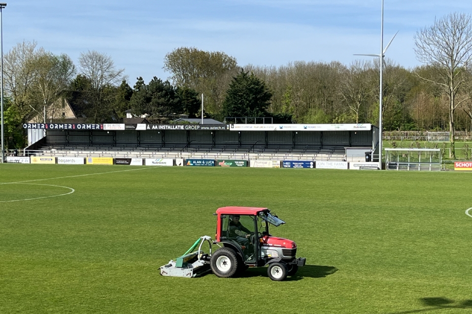 Bij de Zuid-Hollandse voetbalvereniging NSVV in Numansdorp is de veldonderhoudsploeg weer helemaal tevreden. Vrijwilliger Ron van der Veen speelde daarin een rol. Hij was al vrijwilliger, maar acht maanden geleden werd hem gevraagd de vrijwilligersploeg op het voetbalcomplex te begeleiden. De negatieve ervaringen met de bijna antieke, getrokken 250 centimeter brede driedelige kooimaaier zijn nu geschiedenis. Hun tachtigjarige vrijwilliger uit het team maait nu weer met plezier én zonder klagen de vier sportvelden. Hij experimenteert zelfs zeer enthousiast met verschillende maaipatronen. 'Want,' zo verduidelijkt Van der Veen de klachten, 'die door een 35 pk sterke Yanmar getrokken kooimaaier liet veel sporen na in de vochtige kleiachtige bodems. Na een maaibeurt was het gras in die wielsporen altijd langer dan de rest. Ook liet de kooimaaier zich niet lager afstellen dan 4-5 centimeter. Alleen door de velden zeer frequent met een zware rol te bewerken, bleven we de bobbels op de velden de baas. Kortom, bij mijn aantreden heerste er ontevredenheid bij de vrijwilligers en de circa duizend leden over het maairesultaat van de velden. Ik kom als zelfstandige uit de aannemerswereld en heb me in korte tijd het "grasverstand" eigen moeten maken, want als team van vijftien man doen we alle onderhoud op het terrein en de velden zelf. Ik heb veel tijd genomen voor overleg en uitleg.'