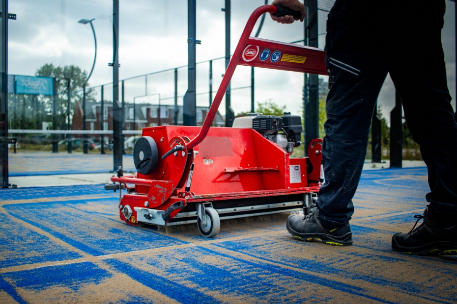 Het wekelijks onderhoud van een outdoor kunstgrasbaan bestaat uit het verwijderen van bladeren en afval op de baan, waarna het infillzand weer gelijkmatig over de baan wordt verdeeld. Dit wordt meestal door de beheerder(s) zelf gedaan met een bladblazer en een veger. Het periodieke onderhoud van het kunstgras besteedt een club doorgaans uit. Allesvoorpadel heeft hier een uitgebreid stappenplan voor, legt Van Boxel uit: 'Bij outdoorkunstgraspadel betekent ons periodiek onderhoud dat we meestal twee keer per jaar langskomen. Onze specialistische meerwaarde uit zich allereerst in het onderhoud van het kunstgras. Infillzand koekt bij intensief gebruik en onder verschillende weersomstandigheden aan wat kan leiden tot verstening van de ondergrond. Om dit te voorkomen maken wij tegenwoordig gebruik van de 360 Spikeroller. Dit is een soort wals met spijkers waarmee het versteende zand tot aan de backing wordt verpulverd zodat de waterdoorlatendheid weer optimaal wordt. Al het zand wordt vervolgens van balpluis en ander materiaal gefilterd met een mobiele reinigingsmachine (Turfsoft van SMG). Daarna borstelen we met een driehoeksbezem de platgelopen vezels van de mat weer overeind. Vervolgens wordt het zand weer herverdeeld over de baan met een geavanceerde borstelmachine (Padmax VX2) en eventueel aangevuld. Tenslotte worden de naden en belijningen door ons gecontroleerd en indien nodig professioneel hersteld. Na deze stappen verkeert de mat weer in optimale speelconditie.'