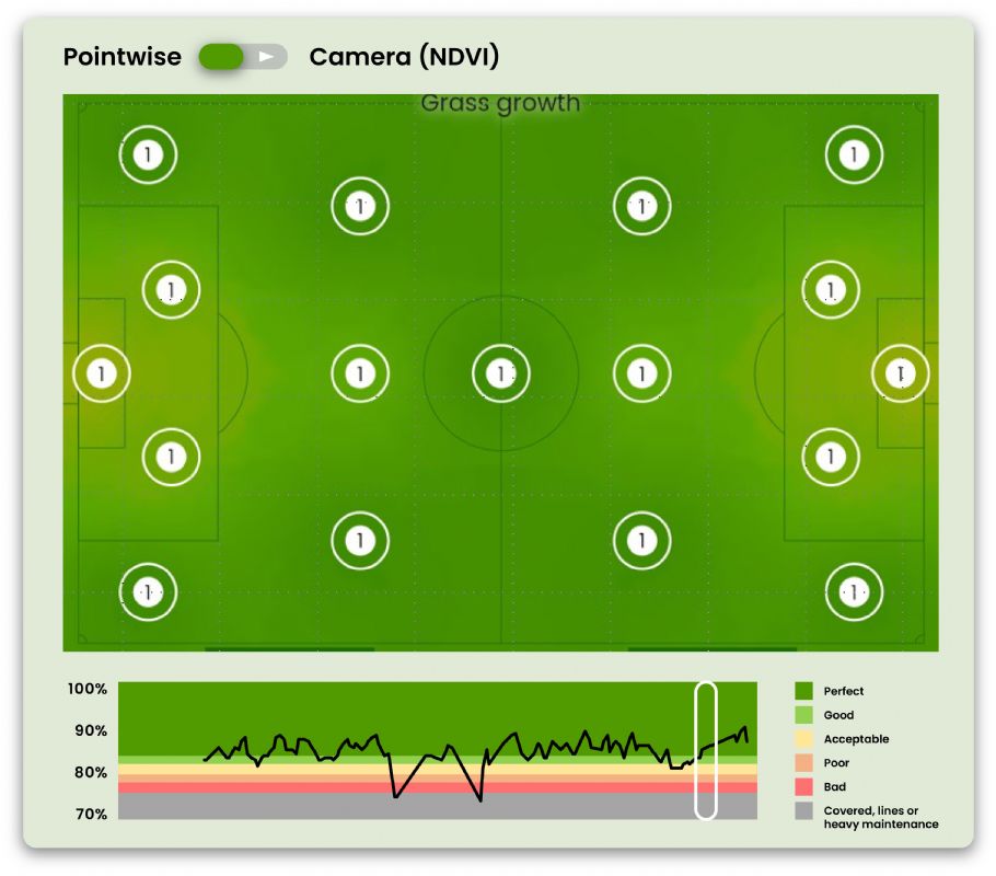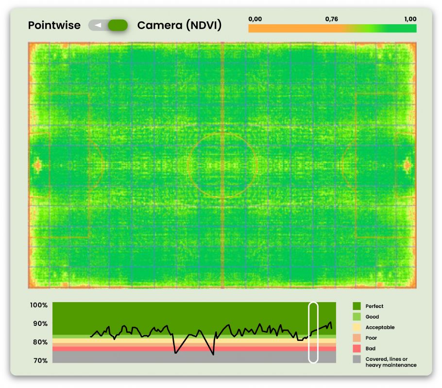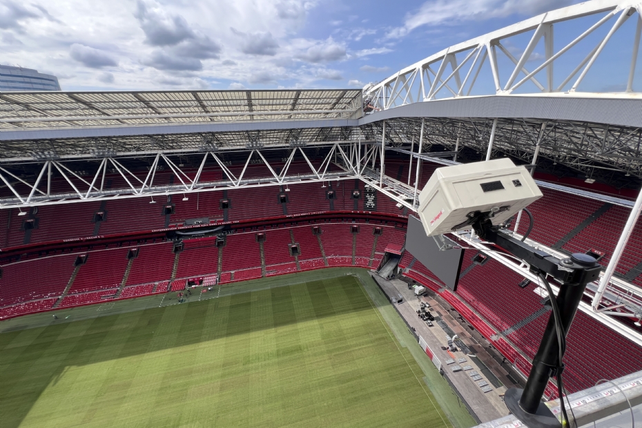 De multispectrale camera, een type dat ook in drones gebruikt wordt, is in staat om 24/7 data over de grasmat te verzamelen, dankzij zeer gedetailleerde beelden die voor het menselijk oog niet waarneembaar zijn. En meer data verzamelen, dat was precies de wens van het grasteam in de Johan Cruijff ArenA. Dit voetbalstadion is de bakermat van datagestuurd veldbeheer; er worden al meer dan tien jaar data verzameld. Alleen dankzij data kon men daar in een betonnen bak gezond gras laten groeien. Meeske: 'Wij waren hier destijds bij betrokken geraakt. We zochten naar een manier om nog makkelijker data te verzamelen. Zo kwamen we op het idee om een camera op te hangen, om 24/7 inzicht te hebben in de toestand van het veld.' Het afgelopen seizoen is al proefgedraaid in het stadion van Ajax. Met de zogenaamde basisversie kan de helft van het veld in de gaten worden gehouden en de gezondheid van het gras worden gemeten. Meeske: 'We hadden liever een camera die het hele veld kan meten, maar uit kostenoverwegingen is dat nog niet mogelijk.'
