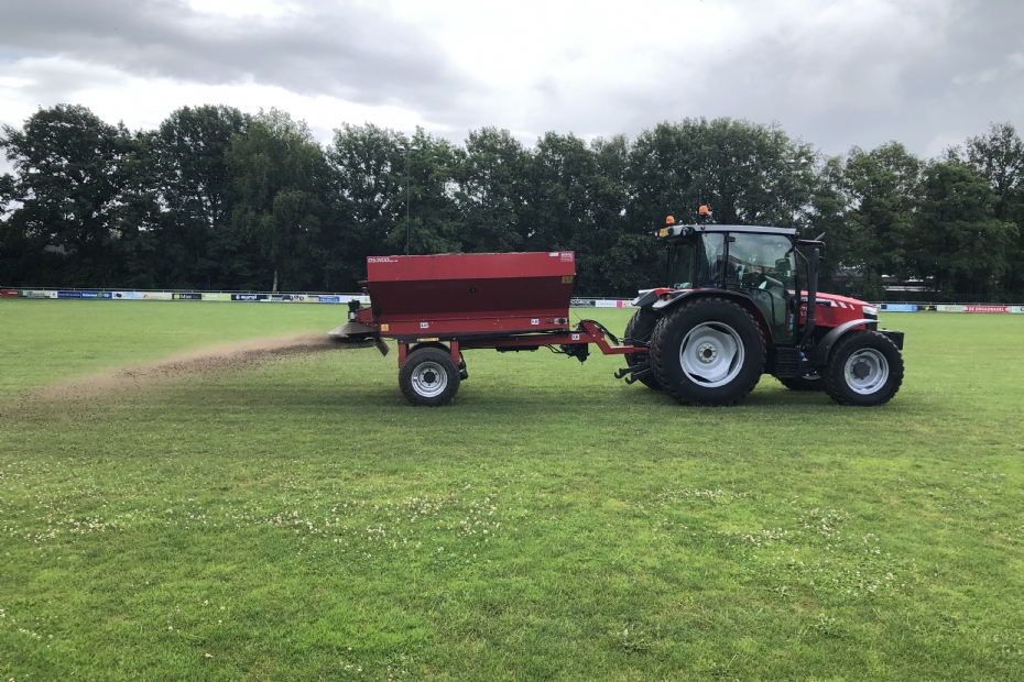 Gerwers had de nieuwe bezander al een keer gebruikt in het najaar om scherpzand te strooien op natte velden. In juni en juli is er zwarte grond gestrooid op de Hellendoornse voetbalvelden. 'Deze bezander werkt heel fijn, omdat alles hydraulisch gestuurd wordt. Via de regelkast in de cabine kun je de snelheid van de schotels en de strooiband eenvoudig aanpassen. Ik ken de velden goed; ik weet dus precies waar ik breder moet strooien of juist extra zand wil neerleggen, bijvoorbeeld bij de zijlijnen die veel belopen worden door de grensrechters.'