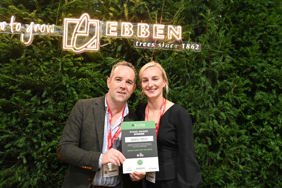 Een Engelse beurs is niet compleet zonder een award voor de beste stand. Deze prijs ging dit jaar naar de Nederlandse firma Ebben Boomkwekers. Marko Mouwen en collega Sofie Ebben tonen trots hun award. Marko Mouwen: 'Wij staan op deze beurs als enige boomkweker en dat is wel een voordeel. Wij hebben al veel contacten gelegd met Engelse gemeentes. Voordeel is natuurlijk dat wij al heel bekend zijn op de Nederlandse markt.'