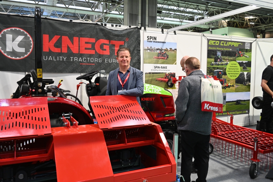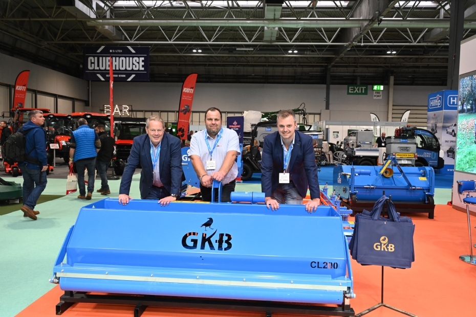 Op Saltex was ook het Nederlands GKB te vinden. Op de foto poseren vlnr Jan Willem Kraaijeveld , de Engelse vertegenwoordiger Tom Shinkins en Niels den Boer en voor de Combislitter 200. DE CL 200 in een relatieve nieuwkomer in het GKB sortiment en gezien worden als opvolger van de Topair. De machine is steviger, robuuster en eenvoudiger en daarnaast volgens Jan Willen Kraaijeveld ook goedkoper door de relatief eenvoudige techniek. De Combislitter is geschikt voor zowel natuurlijke grasvelden als hybride.