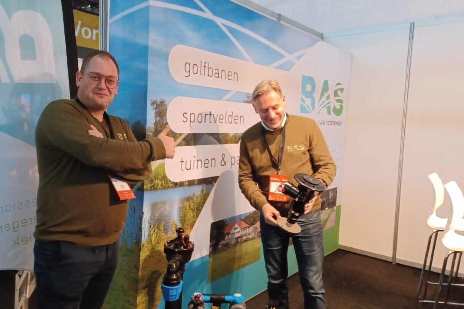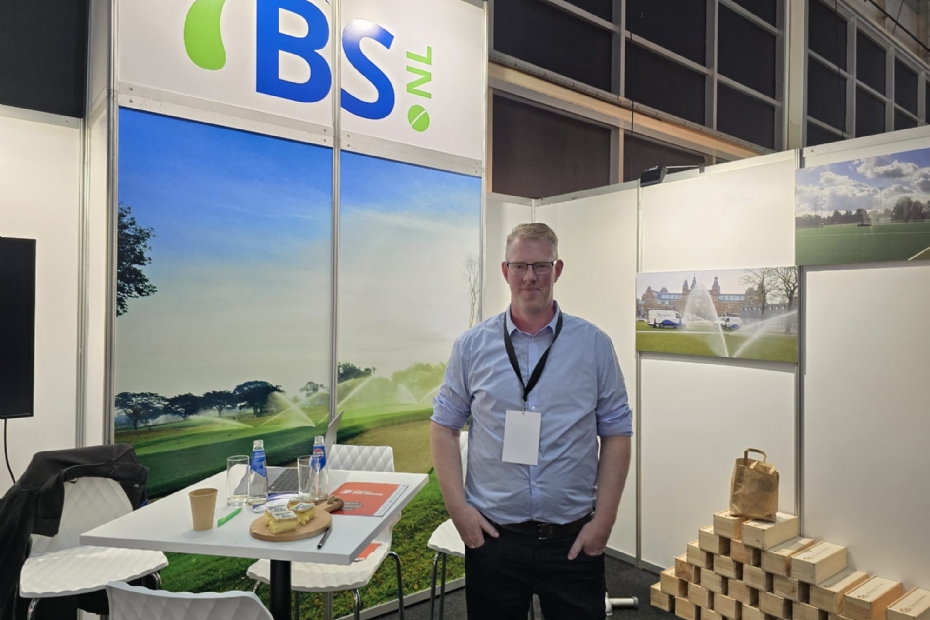 Lenneth-Theun Bosma van Beregeningservice Nederland staat voor het eerst op de sportvak beurs. Thuiswedstrijd, want Beregeningservice is gevestigd in Gorinchem. Op zich heel goed om hier zichtbaar te zijn.