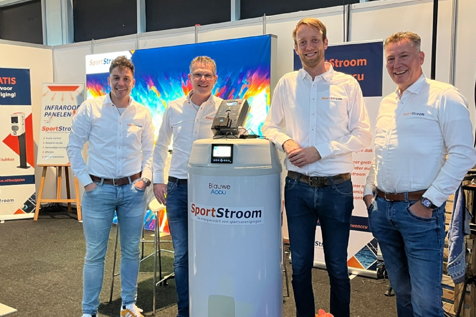 Bij SportStroom poseren Bart Rogaar, Robert den Ouden, Sjoerd Woelders en Jan Tonny Visser (nlnr) bij de gloednieuwe blauwe accu. Vanaf 2027 verdwijnt de salderingsregeling en dan wordt het terugleveren van overtollig zonnestroom duurder, hier kan een blauwe accu toelaas bieden. Een blauwe accu is eigenlijk een techniek om water te verwarmen wanneer de zon schijnt, zodat je als vereniging nooit meer hoeft terug te leveren. Het is geen echte accu.