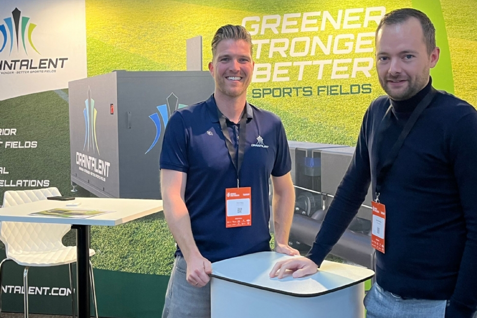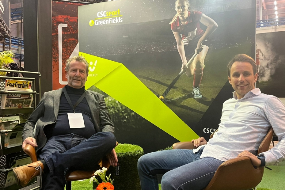 Andre Ceelen en Matthijs Verhoef van CSC Sport - GreenFields. Naast een grote stand ook een apart innovatielab. Hier presenteerden zij innovaties als nonfill voetbal, dry hockey en ONE-DNA.