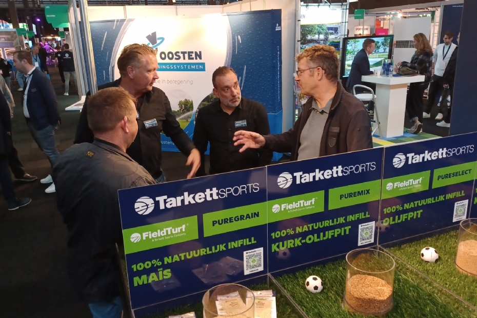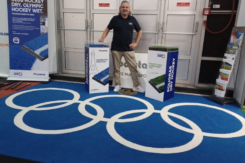 Jan Willem Boon van Polytan heeft een deel van het olympisch hockeyveld meegenomen naar de beurs. Het veld was in Parijs aangelegd door Polytan en moest na afloop van de Spelen elders opnieuw gelegd worden. Het deel met de ringen niet. Na de beurs wil Boon het in zijn kantoor neerleggen.