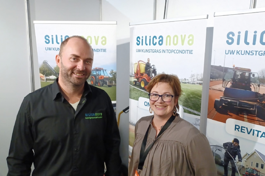 Bastiaan en Heidi Doornewaard van Silicanova weten alles over het onderhoud van kunstgras. De vraag naar hun diensten is groot, mede door de vele neerslag waardoor algen flink kunnen groeien en kunstgrasvelden kunnen veranderen in een ijsbaan.
