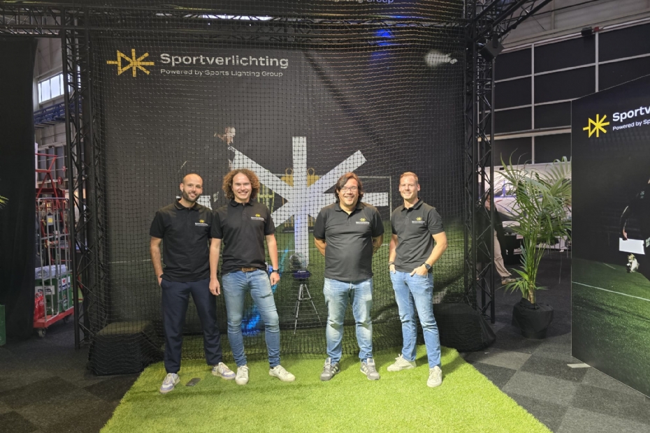 Sportverlichting presenteert een vernieuwde stand met hun nieuwe logo. Door de groei van het bedrijf vonden ze het ook tijd voor een nieuw logo. Op de foto zien we Tomas Oosterwijk, Alessio Leydecker, Ramon Marcus en Jesse.