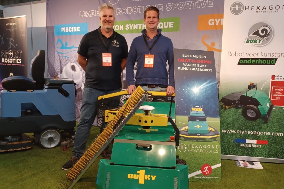 Michel van Deurzen en Sander Schuurman van Hexagone Benelux bij de Buky1, de onderhoudsmachine voor kunstgras.