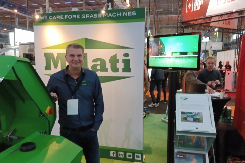 Misja van der Stroom bemant de stand van Milati Grass Machines. 'Dit is altijd een goede beurs voor ons. Er zijn veel verenigingen aanwezig en dat is een belangrijke doelgroep voor ons.'