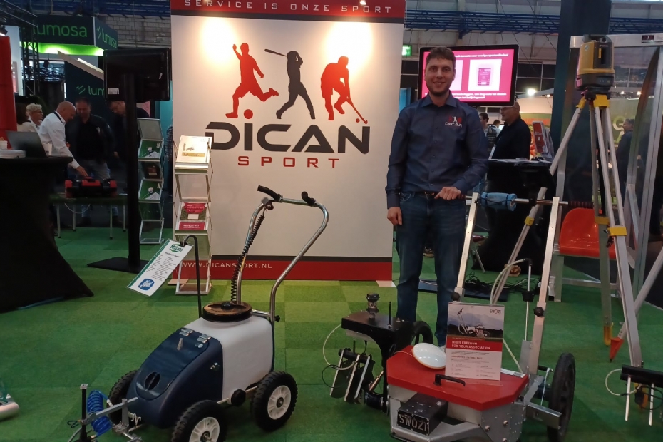Cedric Tuk van Dican Sport geeft graag uitleg over de belijningsmachines van Swozi. 'Voor veel verenigingen is het een grote uitgave. Zij kiezen vaak nog voor een eenvoudigere handbelijner van Fleet.' Komend voorjaar komt dit merk met een robotbelijner. 'Ik verwacht dat die beter betaalbaar is voor clubs.'