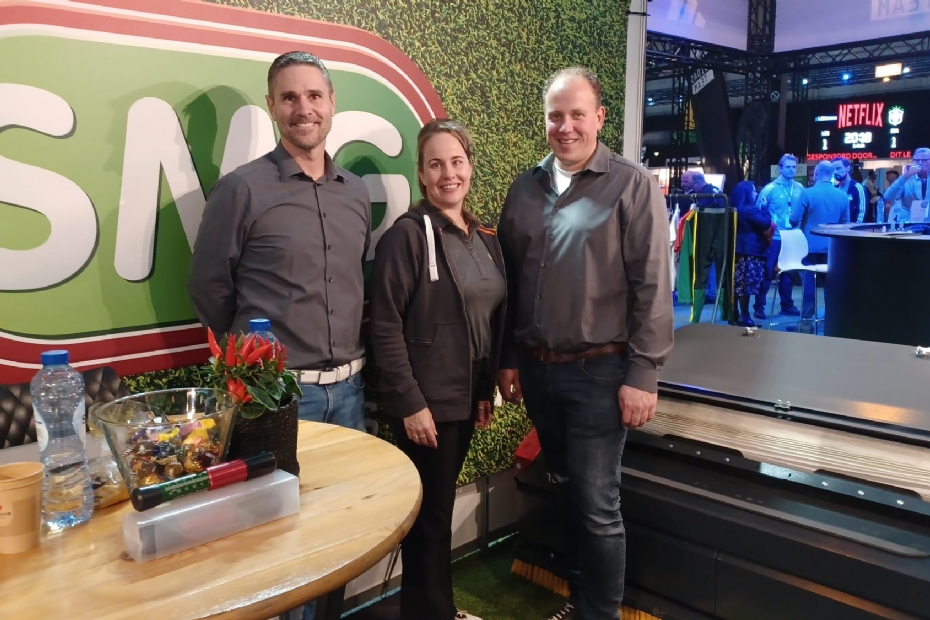 Manager Jochen Saumweber van SMG, Claudia van den Berg en Willem Hak van het bedrijf Van Leeuwenvragen extra voor de nieuwste versie van de TurfKing. Belangrijke veranderingen zijn het nieuwe type filter en het nieuwe zeefsysteem. Bovendien is deze onderhoudsmachine voor kunstgras heel compact en licht is.