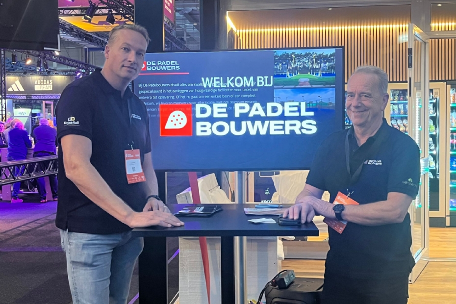 Gloednieuw partij de Padelbouwers heeft haar officiële lancering op de beurs. Sinds juli actief. Partijen units4all, Henitech en Italianpadel zitten erachter. De PadelBouwers is Nederlandse distributeur van Italianpadel en presenteren zichzelf als one stop shop voor levering, montage, fundering, clubhuis en onderhoud. Kortom alles. Op de foto zien we Vincent Korf en Henk Lamar (v.l.n.r.)