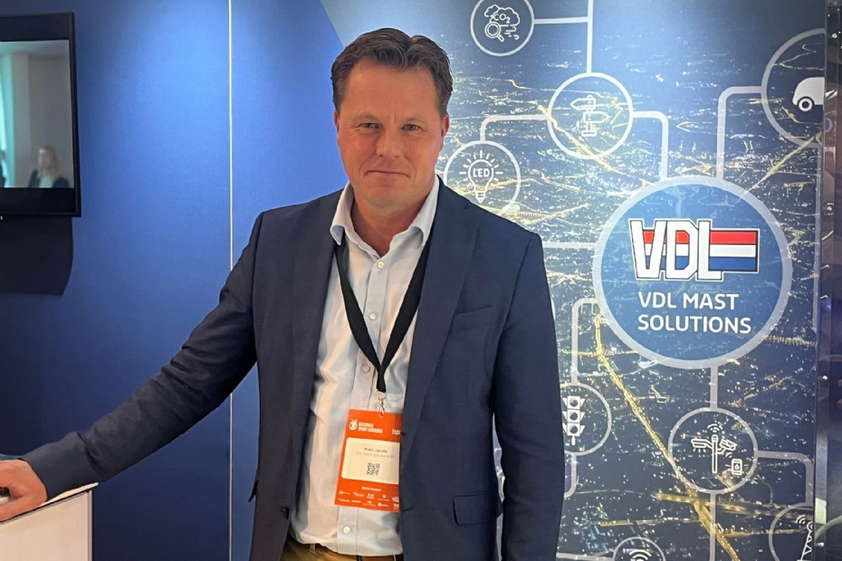 Bram Jacobs van VDL Mast Solutions liet een geïntegreerde lichtmast voor parkeerterreinen van sportclubs zien: elektrische laadpaal en lichtmast in één. 'Die multifunctionaliteit gaan we meer en meer zien in de mastenindustrie, masten met camera's voor dataverzameling en geluid voor op het veld.'