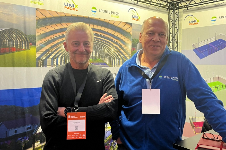 Paul de Goed (l) en Rob de Heer van Unix Padel stonden voor het tweede jaar op de beurs. Unix Padel is de Benelux dealer van Turkse padel producent Unix. Ze leveren kooien, overkappingen, kunstgras, kortom eigenlijk vrijwel alles sinds 2023 op de Nederlandse markt.