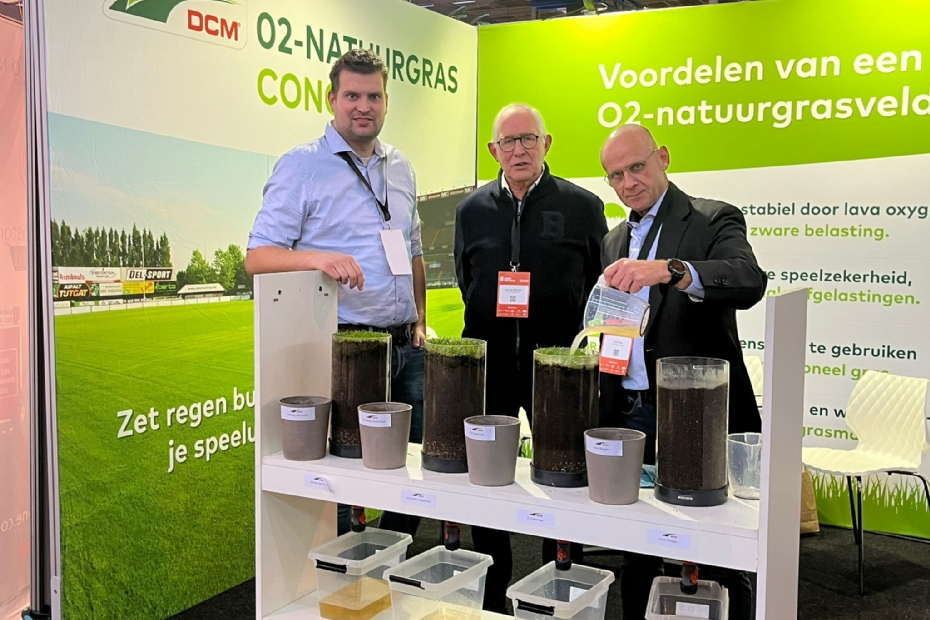 Nieuwe man Perry Kappen (l), Geert van Kerkvoorde en Gerrit Klop van DCM stonden op de beurs met een demo opstelling om te laten zien hoe snel O2 natuurgrasvelden water afvoeren en deels ook bergen in de lavakorrels. Naast het O2 concept, waar inmiddels zo'n 80 velden in Nederland van liggen, is een nieuwe concept in ontwikkeling. Het O2 Stadion substraat. Klopt: 'Dit is ideaal voor sportclubs die omschakelen van kunstgras naar natuurgras. Normaal zou je dan de eerste 40 centimeter wit zand moeten afgraven om weer natuurgras te kunnen laten groeien, met ons concept kun je minder grond afvoeren en vernieuwen. Dit maakt het een stuk goedkoper én duurzamer', aldus Klop. DCM zoekt nu nog een locatie voor een pilotveld.