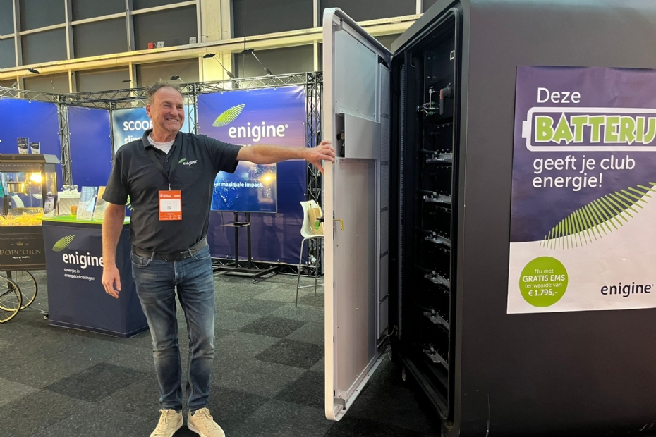 Michiel Zuidwijk van Enigine (voorheen: LedsGoEco) stond op de beurs met een mega batterij. Zuidwijk ziet dat veel sportverenigingen vanuit het verleden nog een grote aansluiting hebben op het elektriciteitsnetwerk, met slimme peak shaving zouden veel clubs uit kunnen met een kleinere aansluiting waardoor ze dus geld kunnen besparen op hun energierekening.