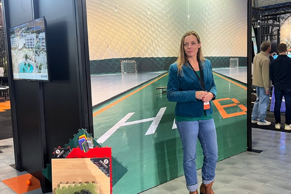 Yvonne Soer, managing director van Royal Campen Sports stond op de beurs met hun modulaire sportvloeren voor zowel binnen als buiten.