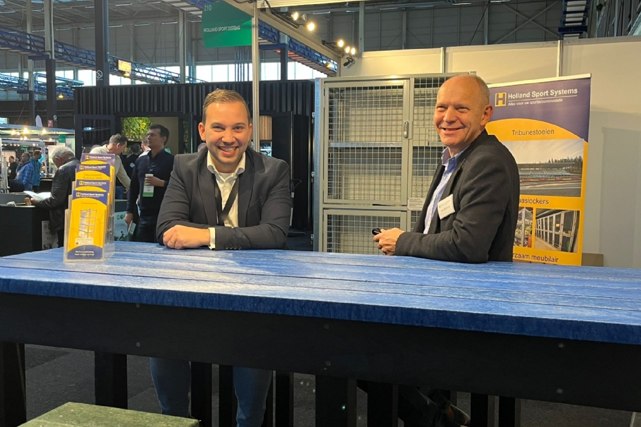 Nils Toonen en Jos Martens van Holland Sport Systems zitten relaxt aan een gloednieuw teamtafel van gereclyced plastic, niet van kunstgras maar petflesjes.
