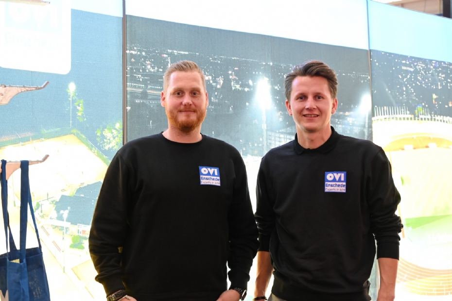 Remco Kuijpers en Pim Beernink (l) van OVI Enschede merkten op de beurs niets van de eerdere heisa dit jaar over enkele geknakte lichtmasten, maar merken over het algemeen wel een toegenomen veiligheidsbesef rondom juiste lichtmasten. 'wij hamerden altijd al op veiligheid van de lichtmast, dit werd vaak weggewuifd, maar nu is het veiligheidsbesef echt terug op de club agenda. '