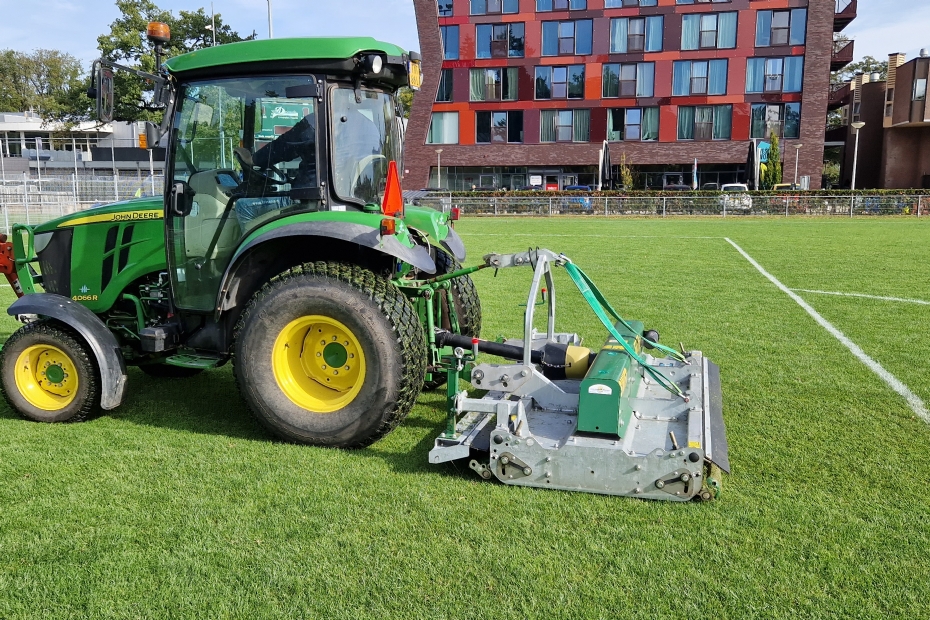 Ballast: 'De Universiteit Twente heeft alle prestatievelden omgezet naar robotmaaien, maar schafte ook nog een Major-maaier aan. Daarmee kan ook een wiedeg worden gebruikt. Zo kun je één werkgang maaien combineren met een andere bewerking voor het onderhoud van de grasmat. Je maakt gebruik van de voordelen van de Major-cirkelmaaier, zoals het maaien en rollen van het veld. En in combinatie met de wiedeg doe je ook aan onkruidbestrijding, bijvoorbeeld van klaver of varkensgras. Met de wiedeg wordt het laag woekerende onkruid omhoog gekamd, waarna de maaimachine dat alsnog afmaait. Dat is een bijkomend voordeel van deze werkcombinatie - mooi meegenomen in het kader van de Green Deal. Een ander pluspunt van onze Major-machines is dat ze door de rollende werking een grasmat kunnen herstellen na intensief gebruik. Een robotmaaier hobbelt gewoon over een losse plag heen, zonder enige bewerking.´