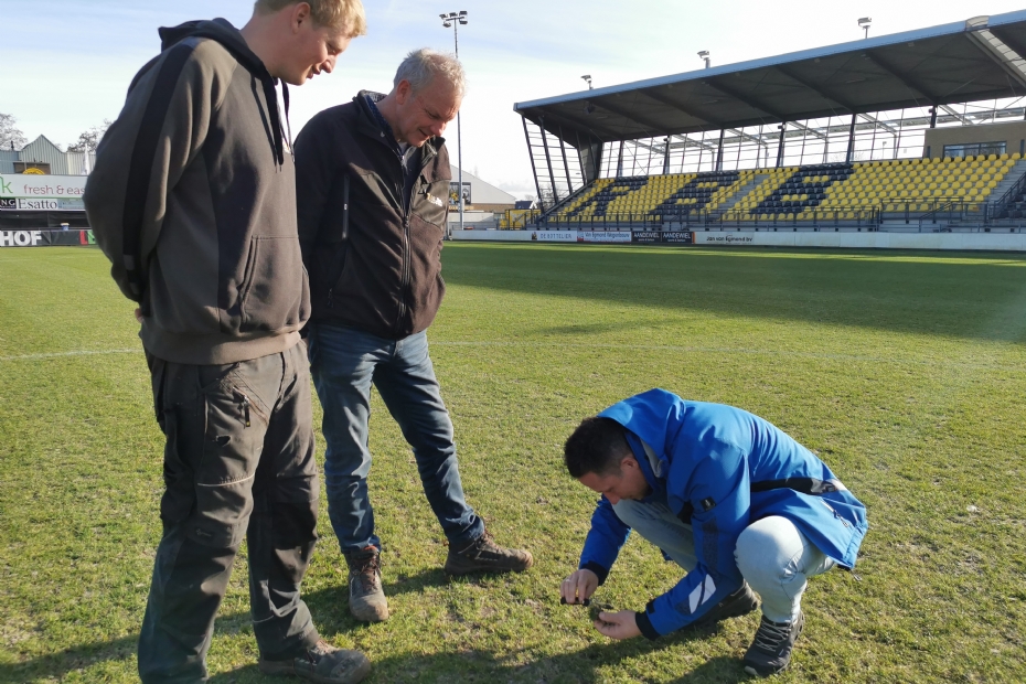 Berry van der Holst van aannemersbedrijf G. van der Holst & Zn kan zich de wedstrijd nog voor de geest halen. 'De mat had stevig geleden,' zo is zijn professionele reactie. Hij verzorgt al zes jaar de velden op het sportpark. Samen met zoon Arjen en een team van medewerkers draagt hij ook zorg voor vele tientallen andere velden in de onmiddellijke regio. Beiden kunnen vol enthousiasme over hun GPS-gestuurde machines praten. 'Maar het is de persoon die het verschil kan maken,' zo merkt senior op. 'Dat begint bij het goed afstellen van de grasmaaier en het ervoor zorgen dat de messen altijd scherp zijn.' Daarnaast benadrukt hij het belang van het regelmatig inspecteren van de grasmat. 'We maaien het gras driemaal per week. Soms maaien we het op de dag voor de wedstrijd zelfs tweemaal, om zo de 28 millimeter speelhoogte te halen.' Rijnsburgse Boys beschikt over een O2-veld dat in 2020 is aangelegd. 'De lava in de onderbouw zorgt voor een goede waterhuishouding en beluchting van het veld. Ook zorgt het voor een stabiele toplaag. Maar door er voortdurend mee bezig te zijn bereik je ook een stabiele mat.' Het veld is afgelopen zomer gerenoveerd. 'De bovenste anderhalve centimeter is gescalpeerd. Daarna is de mat vóór het weekend eerst kruislings ingezaaid met Stadion SV 8 van Advanta. Dat mengsel bestaat voor 50 procent uit Engels raaigras en 50 procent veldbeemd. Na het weekend hebben we met behulp van de breedwerpige Amazone-doorzaaimachine met verticuteerbalk veldbeemd ingezaaid.' Van der Holst gebruikte daarvoor het Oranjebandmengsel Hercules van Advanta. 'Dat is 100 procent veldbeemd en ideaal voor het inzaaien van nieuw aangelegde of gerenoveerde sportvelden,' zo licht Van Putten van Advanta toe. Bij Advanta noemen ze veldbeemd 'het anker van de grasmat'. Van Putten legt uit waarom: 'Het vormt ondergrondse uitlopers en wortelt daarmee heel intensief in het bovenste deel van de toplaag. Het gras is zelfherstellend, slidingproof, wintervast en droogtetolerant.'