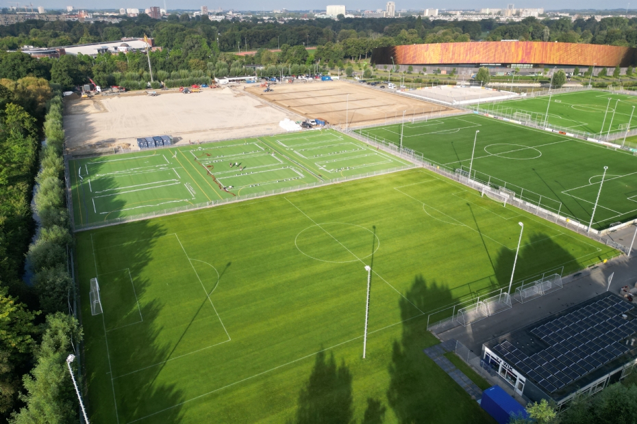 In het Haagse Zuiderpark verrees in recordtijd de nieuwe trainingsaccommodatie van ADO Den Haag. Onder flinke tijdsdruk werden twee en een half hybride GrassMaster-veld en een keepersveld aangelegd, samen goed voor 18.000 m², inclusief een complete infrastructuur. Daarnaast werd een kunstgrasmultiveld verplaatst. 'Tussen de eerste ontwerpschets in april en de projectstart zaten nog geen drie maanden. Dat is eigenlijk gekkenwerk', zegt Maurice Herbert, projectleider bij AH Vrij Groen, Grond en Infra.