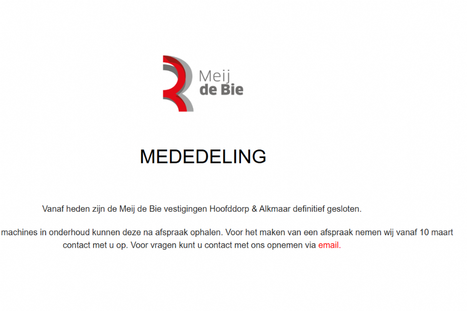 Vestigingen Meij de Bie in Hoofddorp en Alkmaar per direct gesloten |