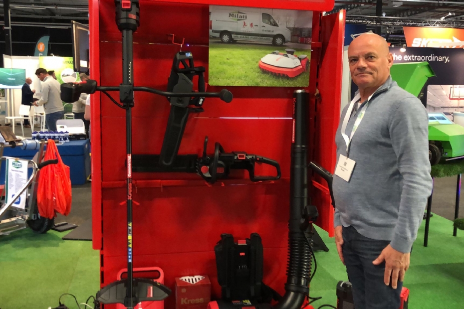 Isin Courage was uit Engeland overgekomen om de belijningsrobot vanFleet naar de stand van Milati te brengen. 'Ik promoot de nieuwste robotbelijningsmachine op de beurs. Naar verwachting is hij begin 2026 in the Netherlands.'