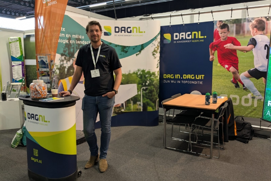 Thijs Avéres van GRAS Advies (onderdeel van DAGnl) zegt: 'Kom langs op de beurs voor meer informatie over de integrale aanpak, herinrichting sportaccommodaties en de openbare ruimte.'