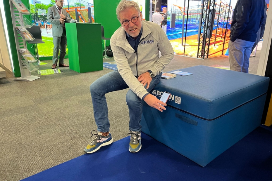 Marketingadviseur Hans Groote Haar van Bosan laat zien hoe de nieuwe toestellen van Bosan allemaal zijn uitgerust met QR-codes. Via de QR-code kom je op een online community (#beweegmee) die door gymfluencers is gevuld met praktische filmpjes. Hierdoor kun je als gymleraar altijd inspiratie opdoen voor je lessen.