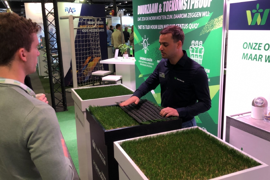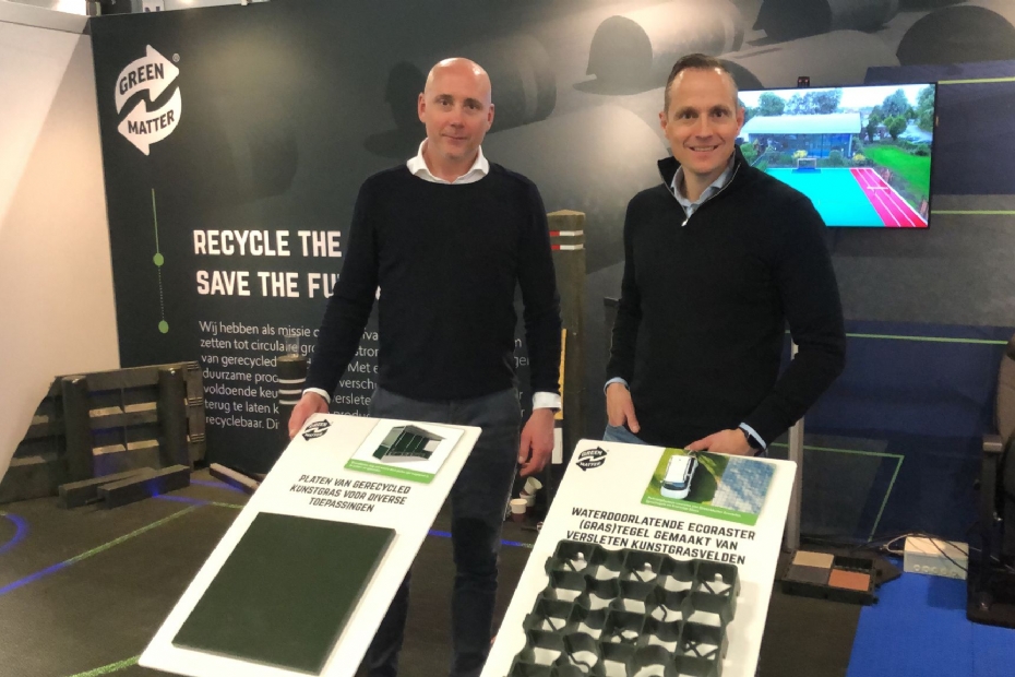 William van Diemen en Kilian Peschel van W&H Sports/ Greenmatter pakken flink uit met hun producten van gerecycled kunstgras. 'Het is belangrijk dat we blijven streven naar een circulaire economie, ook al is er soms wat tegenslag.'