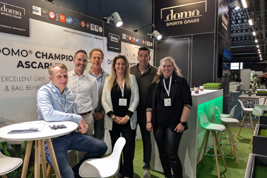 Bas Reinds met zijn team van Domo Sports Grass vroeg aandacht voor het kunstgras Domo Champion Ascari 5g. 'Het is de Ferrari onder de non-infillvelden. Wij hebben het o.a toegepast in Leeuwarden en Den Bosch.'