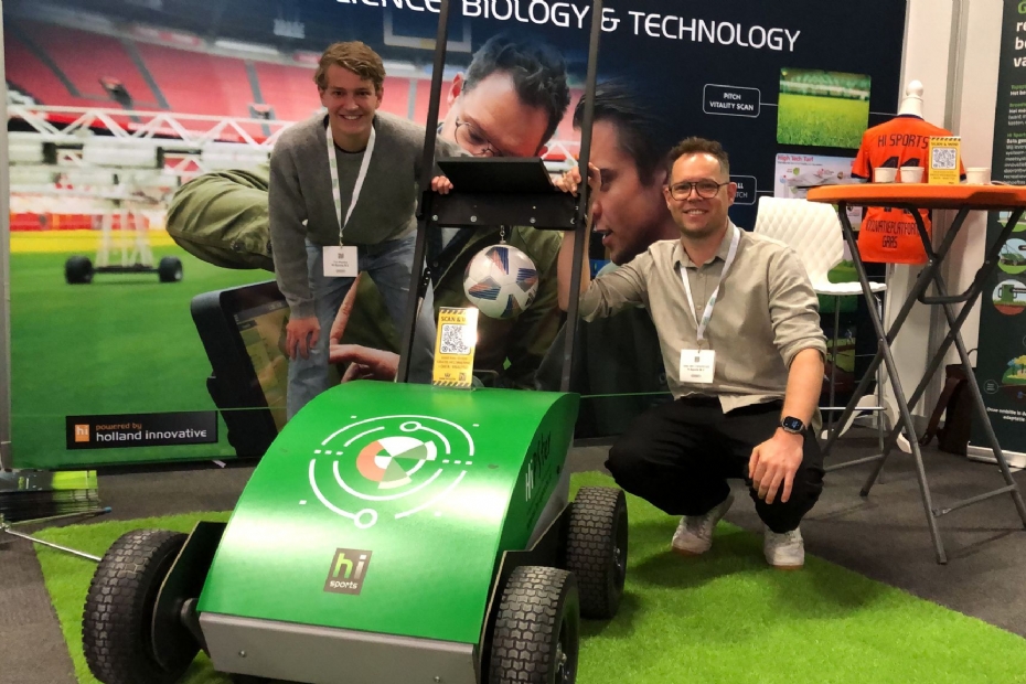 Tijs Meeske en Joep van Cranenbroek Hi Sports vragen aandacht voor de HipSter. Het meetapparaat voor sportvelden wordt continu doorontwikkeld. Nieuw is bijvoorbeeld de bodemsensor die onder andere vocht en temperatuur kan meten.