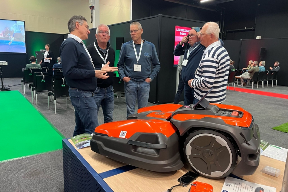 Drukte op de stand bij Husqvarna. Wim van Veldhuizen vertelt bezoekers over de Ceora 544/546. Hiermee kan je tot 75.000 m2 maaien, maaihoogtes tussen 12-60 mm en dat allemaal draadloos via GPS.