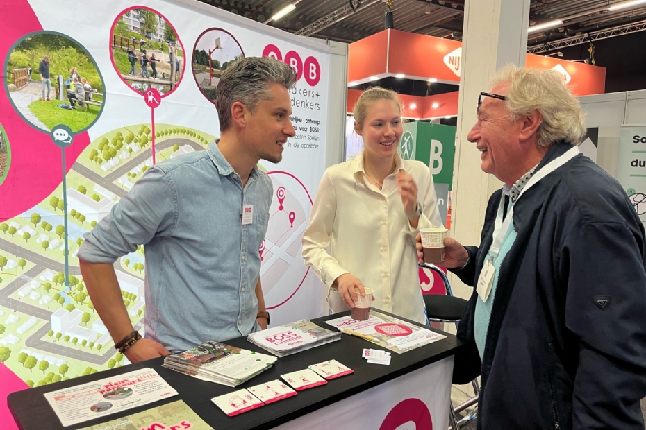 Arjan Vreugdenhil van OBB spelmakers + ruimtedenkers en collega Carmen Hoff informeren bezoekers over hoe ze de openbare ruimte en sportaccomodaties integraal benaderen vanuit de gebruiker. 'Geen onnodige hekwerken, zorg dat het toegankelijk blijft voor iedereen. Zodat iedereen kan bewegen, ontmoeten, spelen en sporten.'
