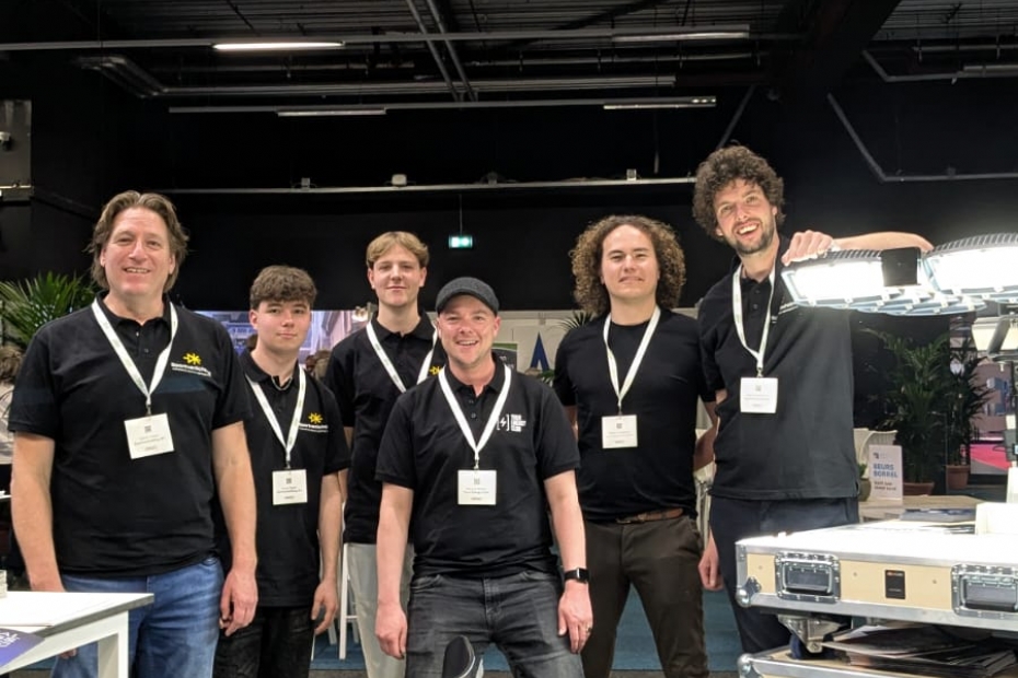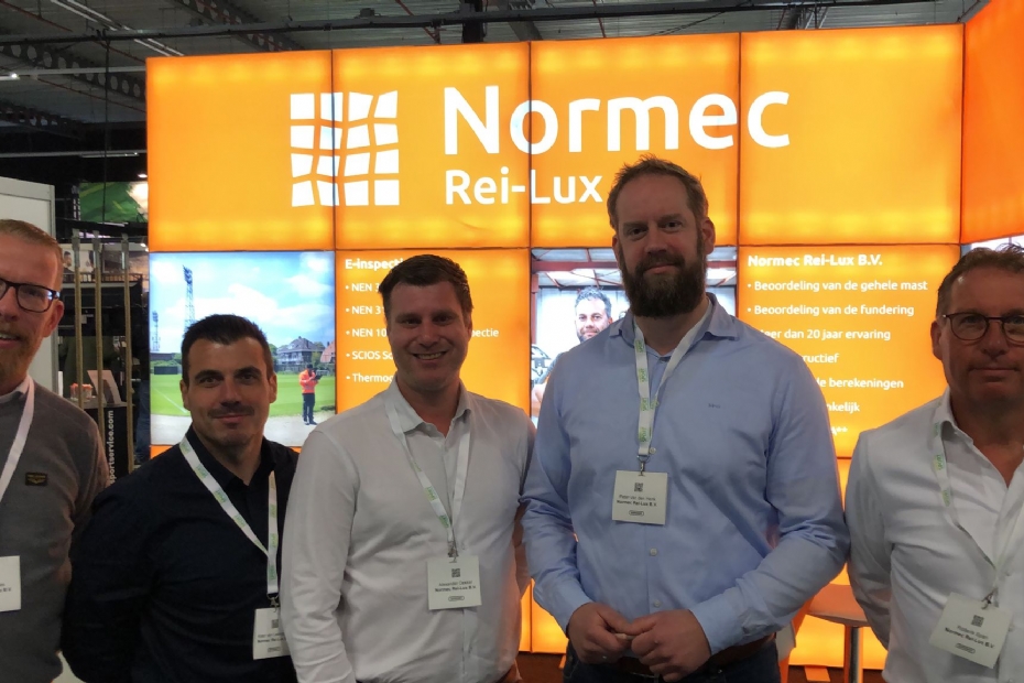 Alexander Dekker, Peter van den Herik, Koen van Leemputten, Martin de Vries en Roderik Span van Normec Rei-Lux.. Het bedrijf zorgt met zijn inspecties voor veilige lichtmasten.