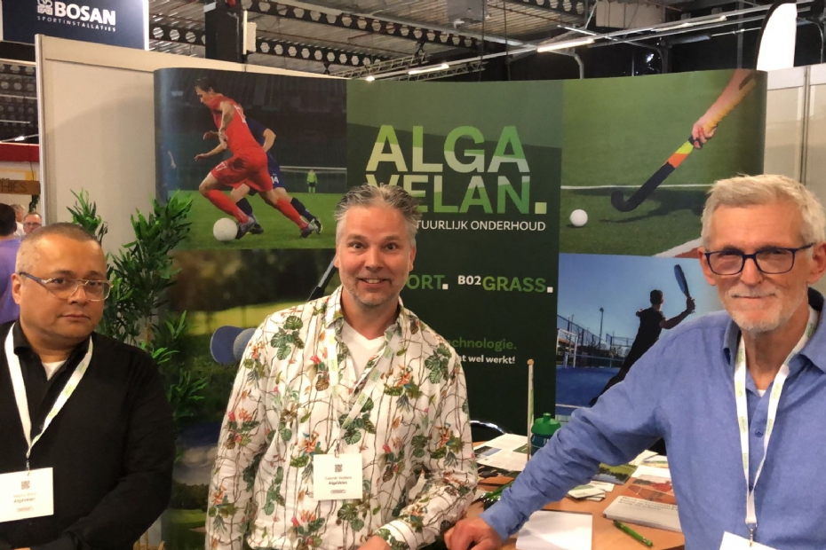 Martin Knot, Gabriël Wolters en Ewout van de Wetering van Algavelan informeren over onderhoud van sportvelden op een honderd procent natuurlijke manier. 'Eindelijk iets wat wel werkt', luidt de leuze bij een van de producten.