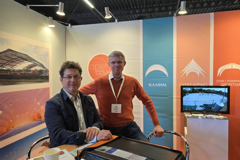 Peter Antonides, nieuw bij Open Cover als accountmanager en Hank Houtman. Open Cover is bekend van de blaashallen. Het bedrijf verbreedt meer en meer met tijdelijke sporthallen en overkappingen voor padelbanen.