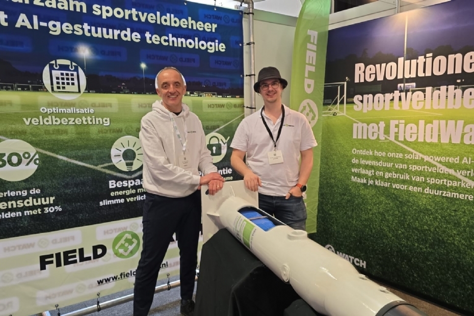 Kor van der Bij en Wouter Horselenberg van FieldWatch BV staan voor het eerst op Vakbeurs Sportaccommodaties. 'Met onze apparatuur kan de veldbezetting gemonitord worden. Voor veel gemeenten is het een eyeopener dat 30 tot 40 procent van het kunstgrasgebruik bestaat uit nevenactiviteiten in plaats van sportactiviteiten.'