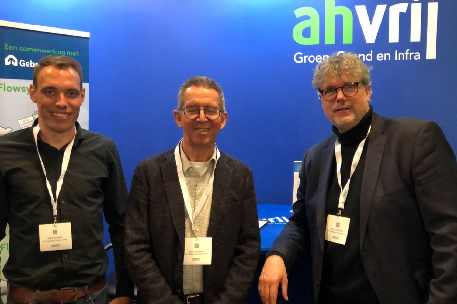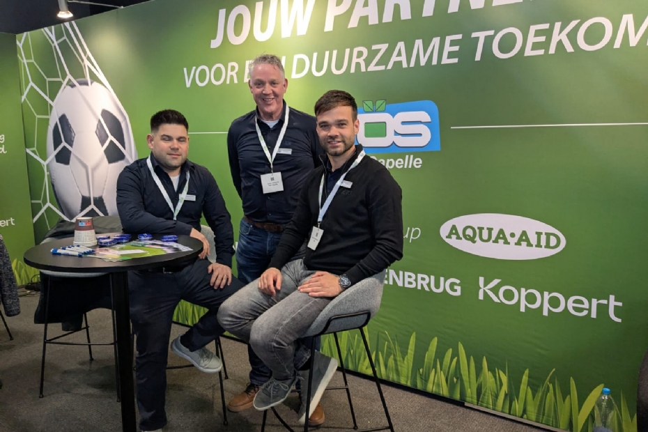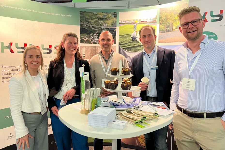 Groot Kybys-team vandaag op de beurs. Pieter Jonker merkt dat er onder gemeenten veel vragen leven rondom de vele innovaties in kunstgrasland. Jonker: 'Vandaag leuke gesprekken gehad. Daarbij gaan wij binnenkort een gloednieuw beheerplatform voor sportvelden lanceren, een hele interessante ontwikkeling.'