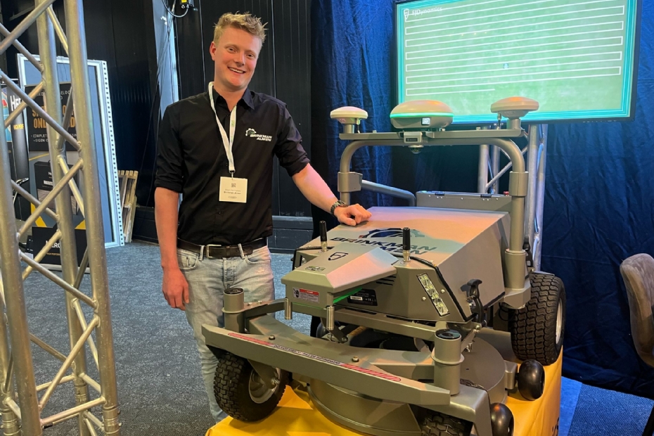 Bram Hennekes van Brinkman Almen met de nieuwkomer FJDynamics op het gebied van robotisering: de RM21 en lijnmarker. Hennekes heeft nu recent de eerste robotmaaier aan sportclub in Almen verkocht.
