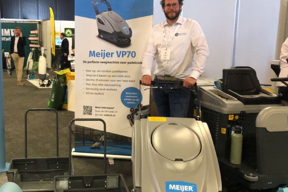 Metech heeft een machine op de markt gebracht die geschikt is voor het onderhoud van padelbanen binnen en buiten. Sjan Landwaart : ' de machine kan reinigen en zand verdelen.'