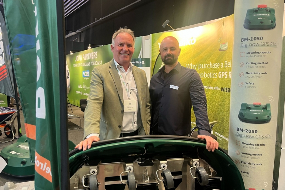 Bij Belrobotics Yamabiko bemannen Teun Bogaerts en Onno Brenninkmeijer de stand. Voor de golf heeft Belrobotics recent nieuwe maaischijven uitgebracht, hiermee kan je lagere maaihoogten instellen. Een belangrijkere, maar minder visuele verandering is de update van de software. Brenninkmeijer: 'Hierdoor zijn onze robots slimmer geworden en kunnen ze efficiënter werken.'