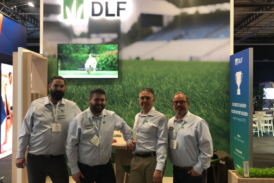 Erik Dolstra, Thomas van Tetering, Peter Bartels en Frank de Dobbelaere van DLF vragen in hun nieuwe stand aandacht voor hun grassen die hoog scoren in de Grasgids.